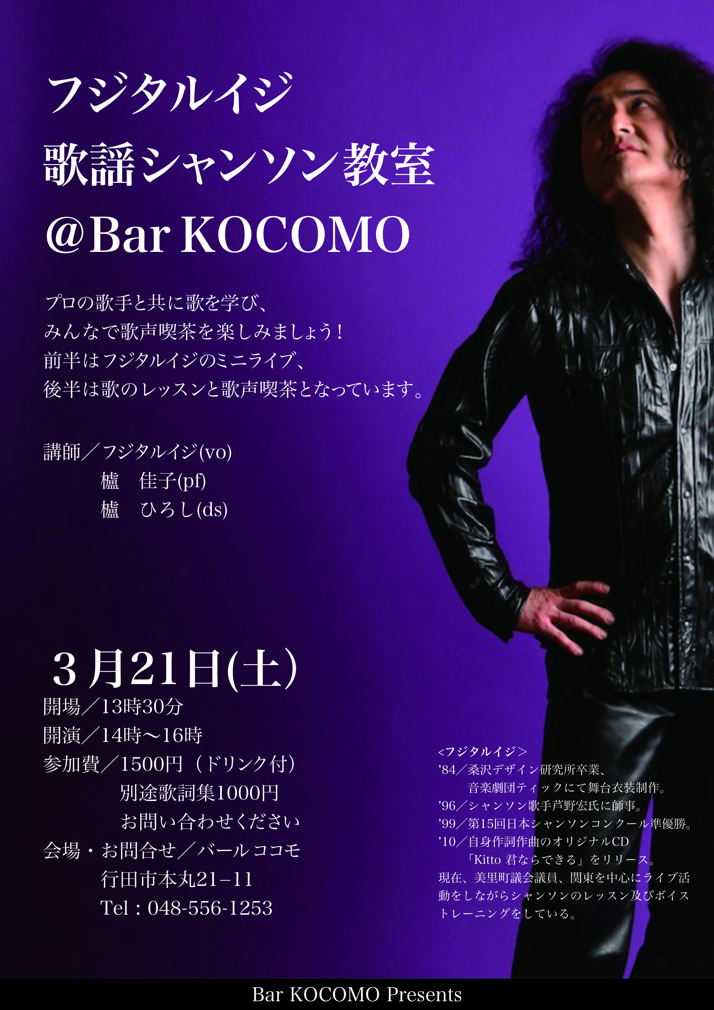 前半はシャンソン歌手「フジタルイジ」のソロライブ。後半は歌謡シャンソン教室で皆さんと歌います。